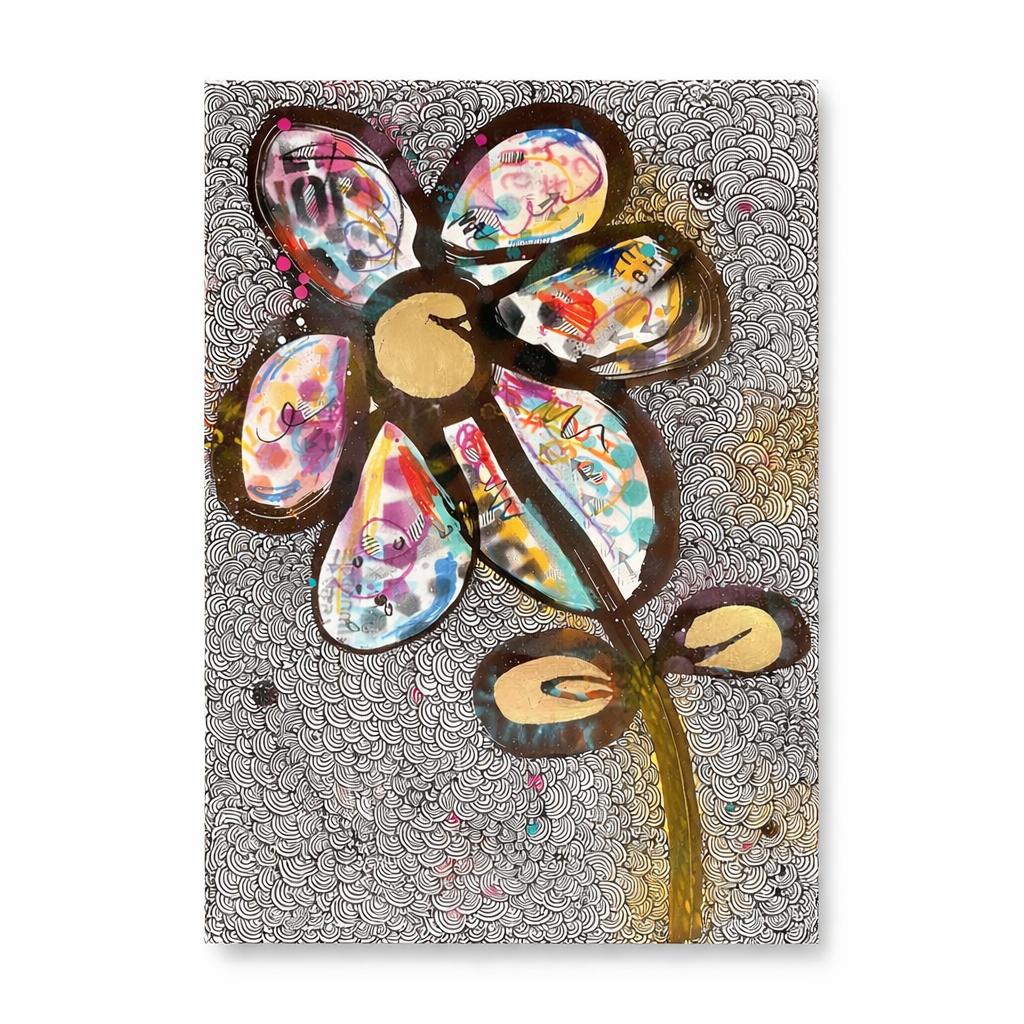 A large playful mixed media urban style flower, created with layers of graffiti, stencils, oil pastels, spray paints, ink, and pencil.