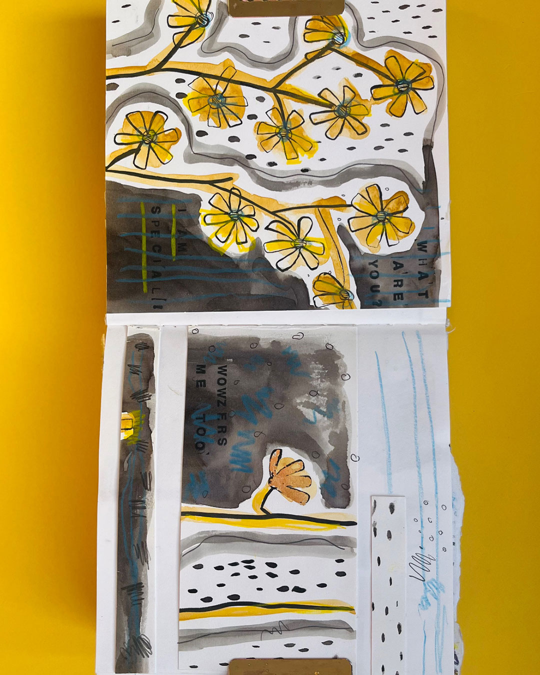 My sketchbooks are a way for me to be spontaneous, work across multiple pages at once, recycle and use left overs from current projects, a place to test something out before the real piece, document, experiment and feel safe.
